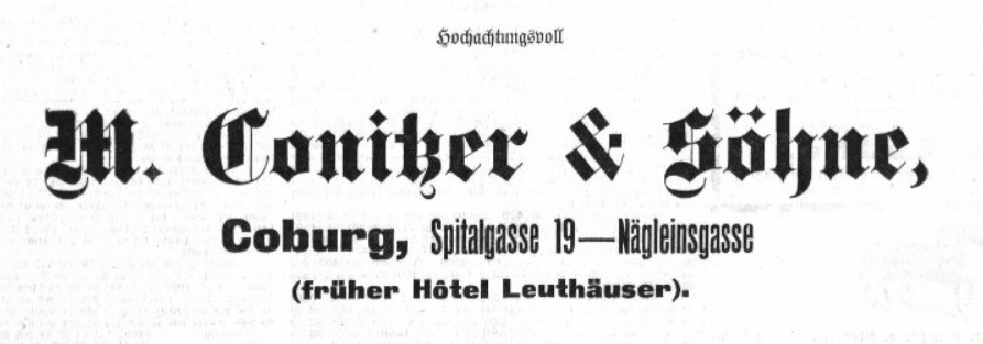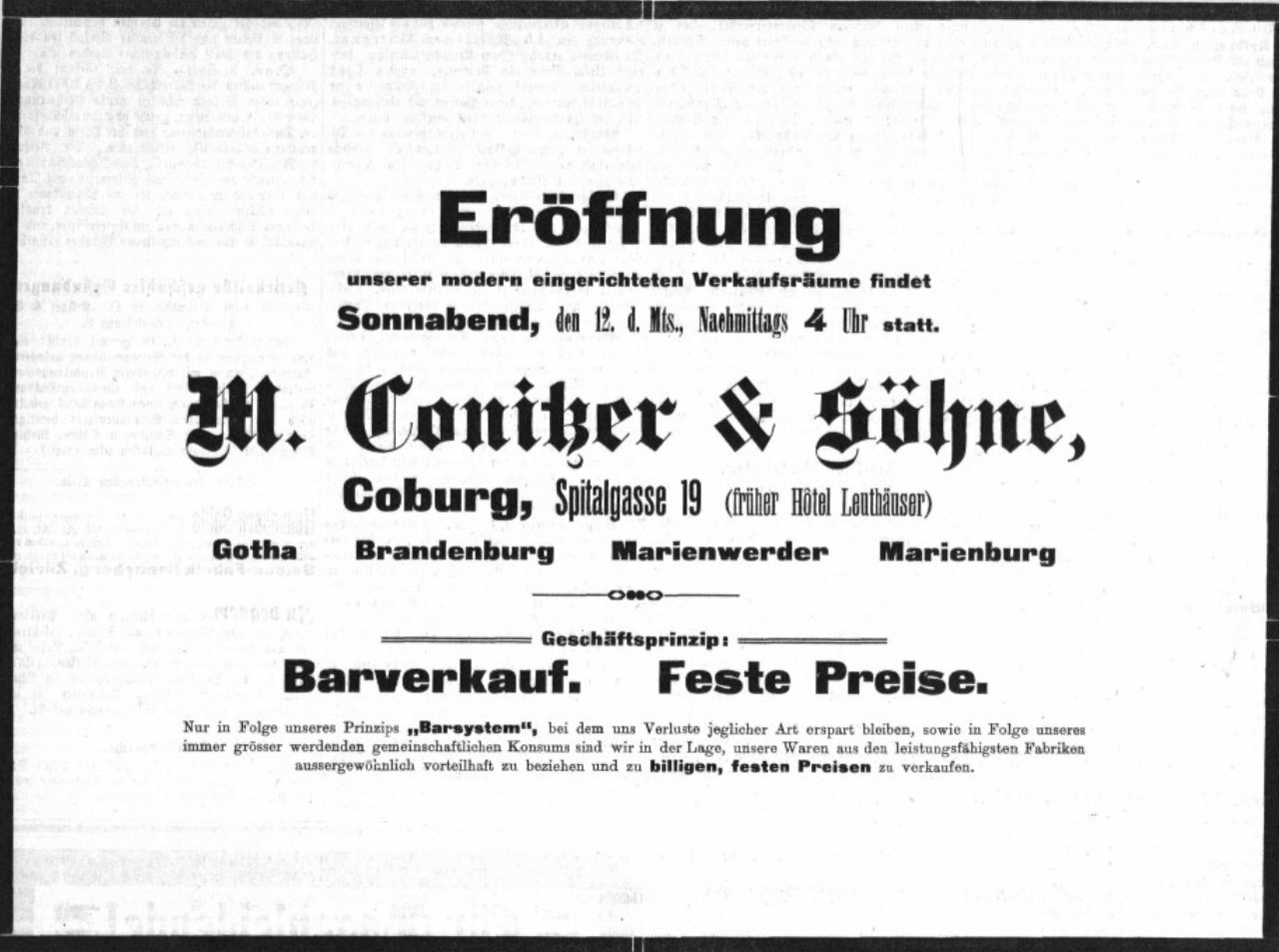 Ab dem 12. September 1903 zog das Kaufhaus M. Conitzer & Söhne in die Spitalgasse 19 in Coburg ein (siehe Anzeige der Firma M. Conitzer & Söhne in der Coburger Zeitung, Abb. 1) und eröffnete dort ein Kaufhaus. Ab diesem Zeitpunkt war ganz Coburg Gast in den Räumen der Spitalgasse 19 und konnte dort die Waren des neuen Geschäfts begutachten und in bar einkaufen zu festen Preisen. Hier galt, wie auch in Marienwerder, das neue “Baarsystem” als Geschäftsprinzip.