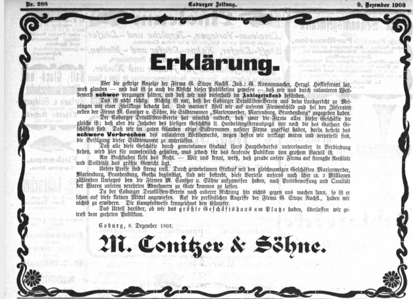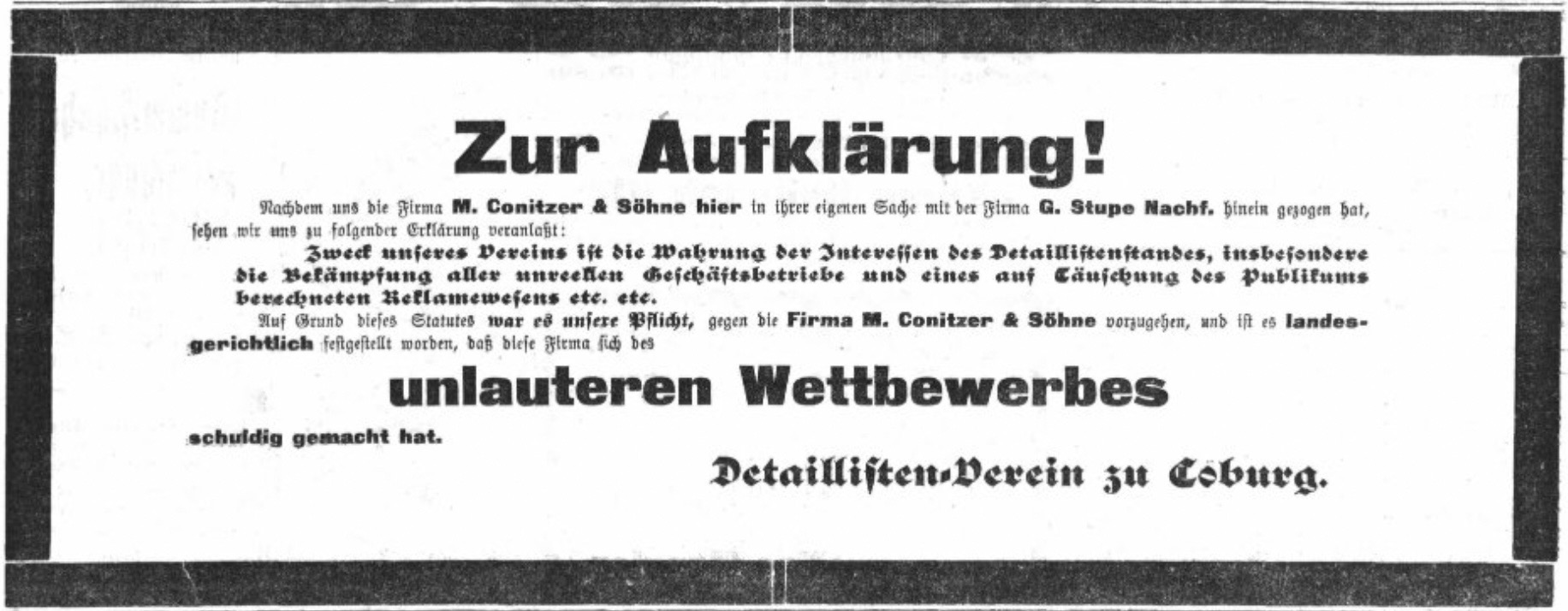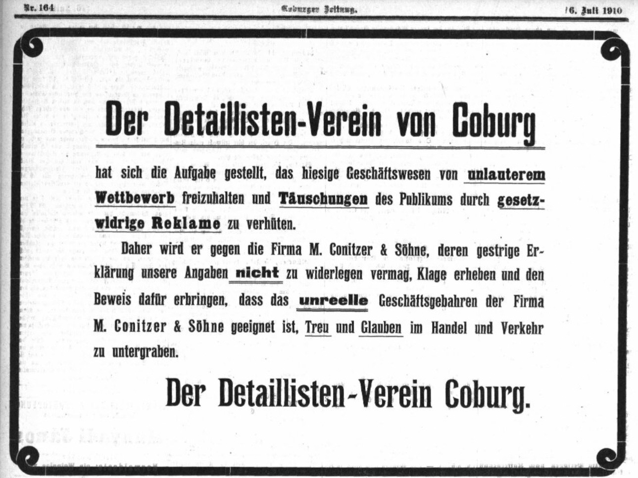Am 11.12.1903 veröffentlichte der Detaillistenverein, ein Zusammenschluss der Einzelhändler (damals Detaillisten) in Coburg, eine eigene Erklärung in der Coburger Zeitung. Dort heisst es: „Zweck unseres Vereins ist die Wahrung der Interessen des Detaillistenstandes, insbesondere die Bekämpfung aller unreelen Geschäftsbetriebe und eines auf Täuschung des Publikums berechneten Reklamewesens etc. etc. Auf Grund dieses Statuses war es unsere Pflicht, gegen die Firma M. Conitzer & Söhne vorzugehen, und ist es landesgerichtlich festgestellt worden, daß diese Firma sich des unlauteren Wettbewerbes schuldig gemacht hat.“