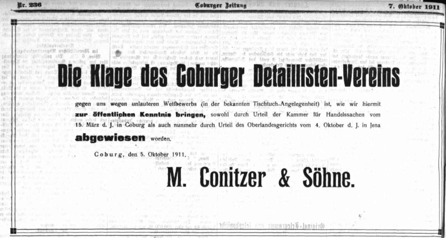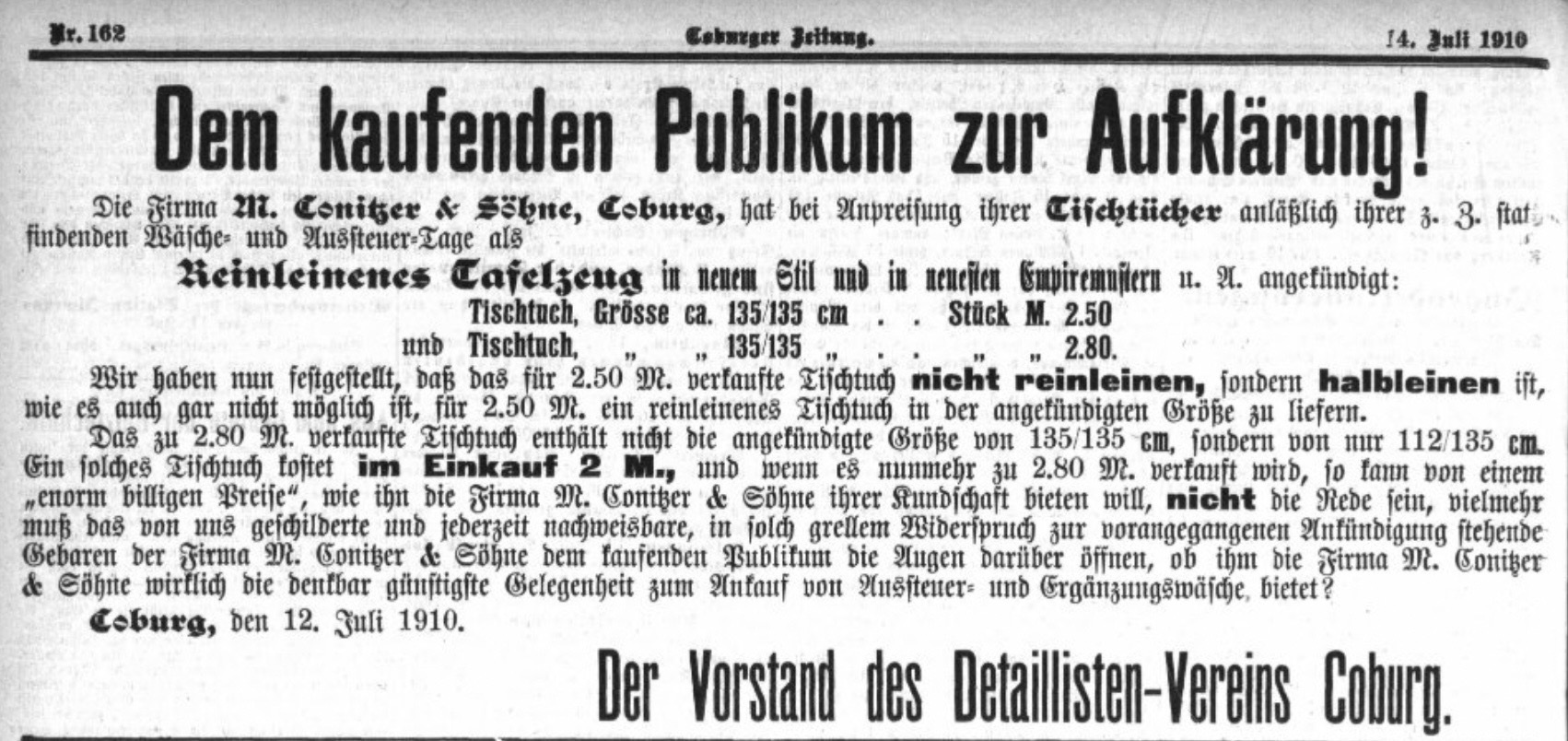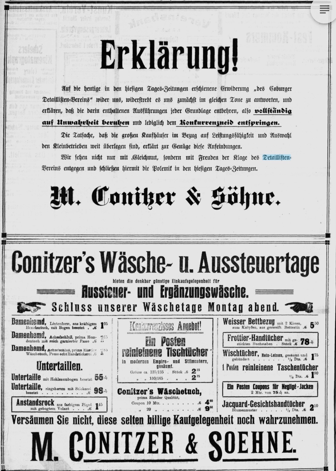 Am 11.12.1903 veröffentlichte der Detaillistenverein, ein Zusammenschluss der Einzelhändler (damals Detaillisten) in Coburg, eine eigene Erklärung in der Coburger Zeitung. Dort heisst es: „Zweck unseres Vereins ist die Wahrung der Interessen des Detaillistenstandes, insbesondere die Bekämpfung aller unreelen Geschäftsbetriebe und eines auf Täuschung des Publikums berechneten Reklamewesens etc. etc. Auf Grund dieses Statuses war es unsere Pflicht, gegen die Firma M. Conitzer & Söhne vorzugehen, und ist es landesgerichtlich festgestellt worden, daß diese Firma sich des unlauteren Wettbewerbes schuldig gemacht hat.“