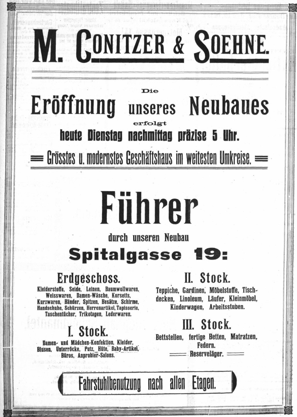 Am 08.03.1910 eröffnete ein neues, hochmodernes Geschäft in der Spitalgasse 19 (Abb 6). In der Anzeige wurde auf die Fahrstühle hingewiesen und, dass es sich bei dem Kaufhaus M. Conitzer & Söhne, um das „größte und modernste Geschäftshaus im weitesten Umkreise“ handele. Eine Zentralheizung war auch vorhanden.
