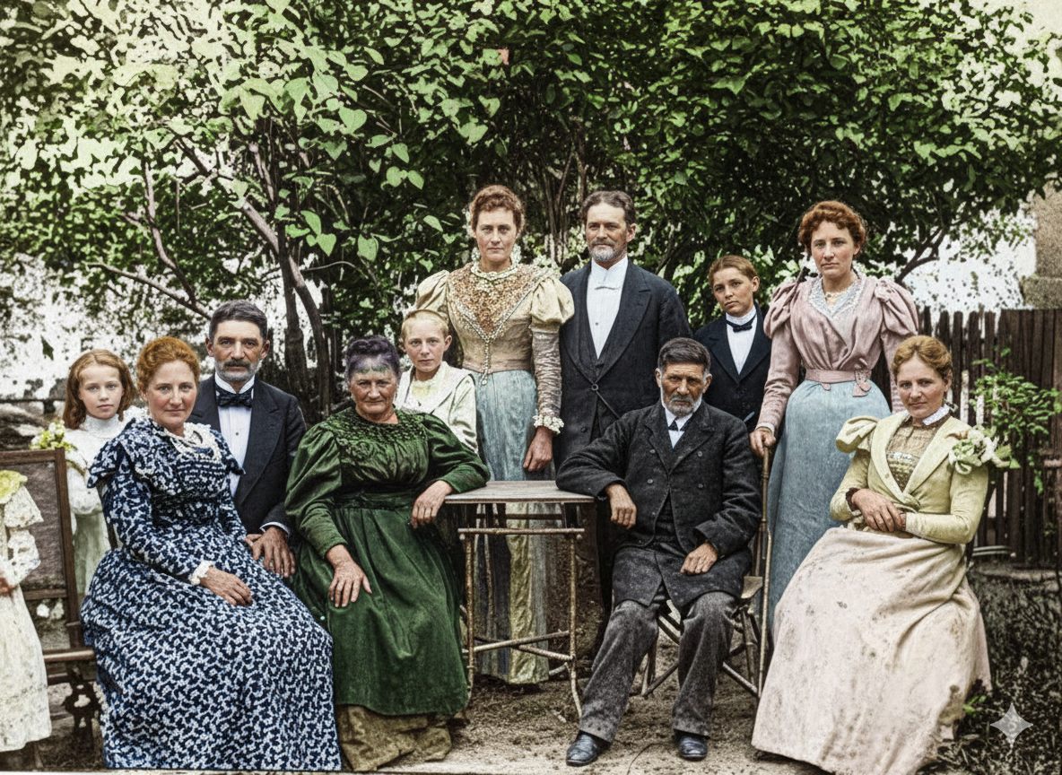 Digital aufgearbeitetes Bild zum Fest der Verlobung von Alexander Conitzer mit Daja Dorothea Müller etwa 1890 im Garten von Moses und Ernestine Conitzer. Auf dem Bild sind zu sehen von links nach rechts: Herta Conitzer (später Davis), Sara Flatauer (geb. Conitzer), Lesser Flatauer (?), Ernestine Conitzer (geb. Bennheim), Bruno Marcus, Daja Dorothea Müller, Alexander Conitzer, Moses Conitzer, Arthur Marcus, Ernestine Bieber, Rahel Marcus (geb. Conitzer). Das Bild stammt aus der Sammlung John Henry Richter [3] und wurde ihm von Magarete Jacoby (geb. Conitzer) übergeben. Die Namen stammen von Erna Cohn (geb. Conitzer).